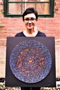 Becherka od lat konsekwentnie pracuje z materiałami odrzuconymi – głównie bezużytecznymi przewodami i kablami, które w jej twórczości tracą swoją pierwotną funkcję, stając się budulcem malarskich kompozycji. W obrazach nie są już elementem infrastruktury, lecz nośnikiem rytmu, światła i struktury. Artystka buduje z nich dynamiczne układy przypominające mapy przepływów – energii, emocji, informacji. To abstrakcyjne pejzaże współczesności, w których splątane linie układają się w organiczne formy, pulsujące kolorystycznym napięciem.